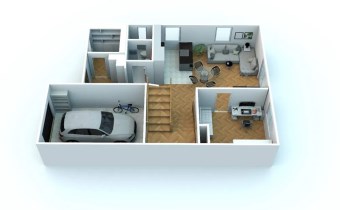 PARTER: salon połączony z kuchnią, gabinet, WC, garderoba, hall, komunikacja, klatka schodowa, garaż.
