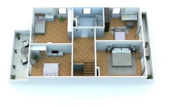 PIĘTRO: 4 sypialnie (w tym dwie z wyjściem na wspólny balkon), łazienka, komunikacja, klatka schodowa.