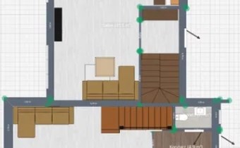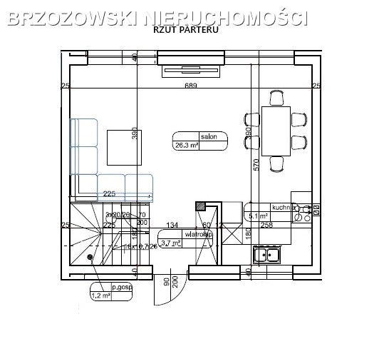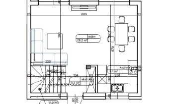 PARTER: salon (26,3 m2) z aneksem kuchennym (5,1 m2), wiatrołap (3,7 m2), pom. gospodarcze (1,3 m2).