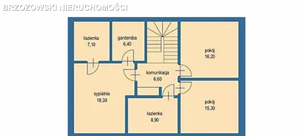 PIĘTRO: 3 sypialnie (19,3 m2, 16,2 m2, 15,3 m2), największa z własną łazienką (7,1 m2) i garderobą (6,4 m2), druga łazienka (8,9 m2), komunikacja (6,3 m2).