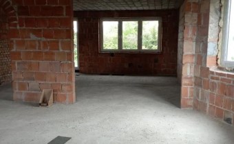 Dom jest do wykończenia: tynki, podłogi, instalacje wewnętrzne.