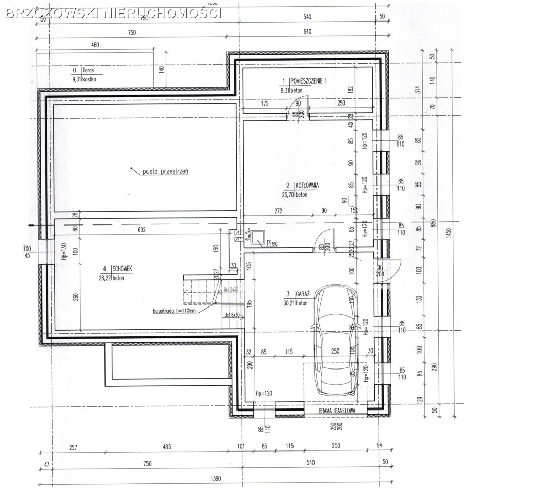 PIWNICA: garaż (30,21 m2), kotłownia (25,70 m2), schowek (28,22 m2), pomieszczenie (9,31 m2).