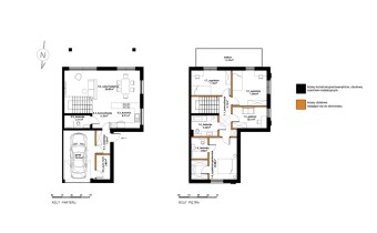 PARTER: narożny salon z aneksem kuchennym (40,42 m2), z wyjściem do ogródka, wiatrołap (3,59 m2), klatka schodowa (5,36 m2), łazienka (3,74 m2), garaż (18,05 m2), pomieszczenie techniczne (3,80 m2).