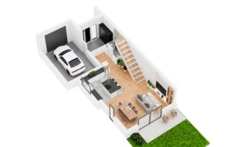 PARTER: narożny salon z kuchnią (45,83 m2) z wyjściem do ogrodu, WC (2,29 m2), klatka schodowa, komunikacja (6,01 m2), garaż (20,84 m2).