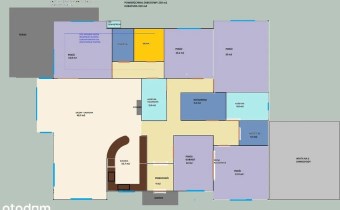 Dom PARTEROWY: narożny salon połączony z jadalnią (48,5 m2), kuchnia (10,7 m2), 5 pokoi (20 m2, 18,8 m2, 15,2 m2, 12,9 m2 i 10 m2), dwa ostatnie połączone drzwiami rozsuwanymi, dwie łazienki (6,6 m2, 5,9 m2), garderoba (4,3 m2), spiżarnia, sauna, holl, wiata na dwa samochody.