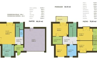 PARTER: narożny salon z jadalnią (23,40 m2), połączony z kuchnią (9,65 m2), toaleta (1,92 m2), hol (4,28 m2), wiatrołap (3,73 m2), klatka schodowa (3,62 m2), garaż na dwa samochody (33,60 m2).