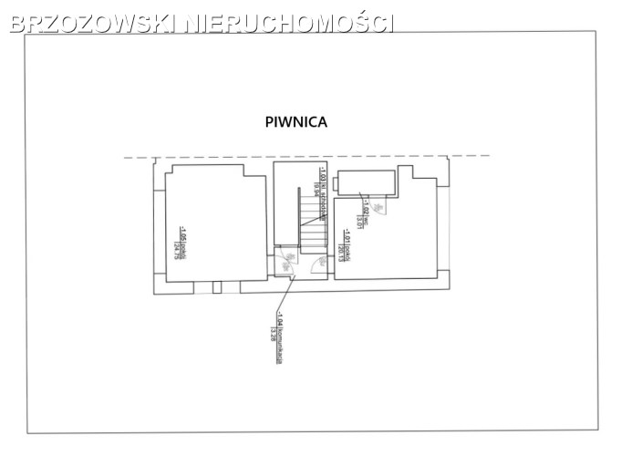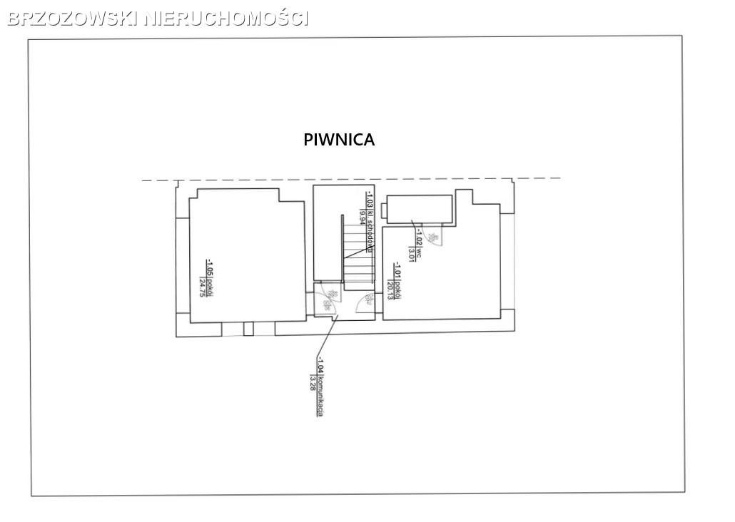 PIWNICA (61,11 m2): dwa pomieszczenia (24,75 m2, 20,13 m2 m2), WC, klatka schodowa, komunikacja.