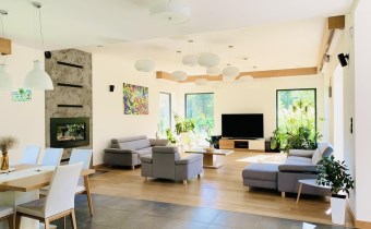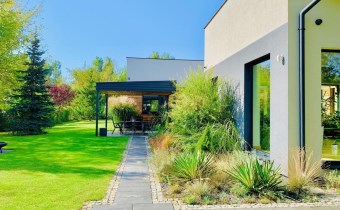Nowoczesny dom parterowy o powierzchni 305 m2, na działce 2011 m2, zlokalizowany na zamkniętym osiedlu w Konstancinie-Jeziornie, blisko rzeczki "Jeziorka"