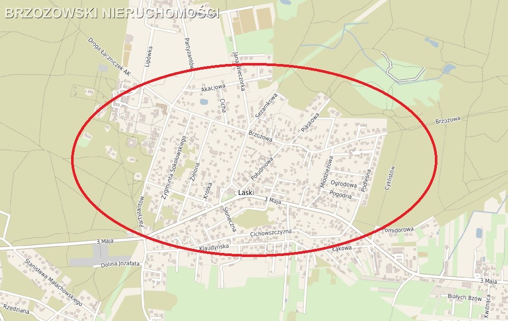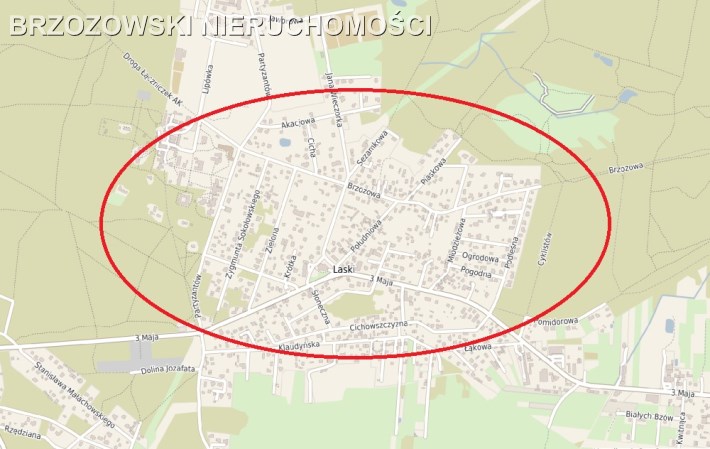 Oferujemy do sprzedaży działkę budowlaną o powierzchni 2100 m2, zlokalizowaną w Laskach (gmina Izabelin), w rejonie ulicy Brzozowej.