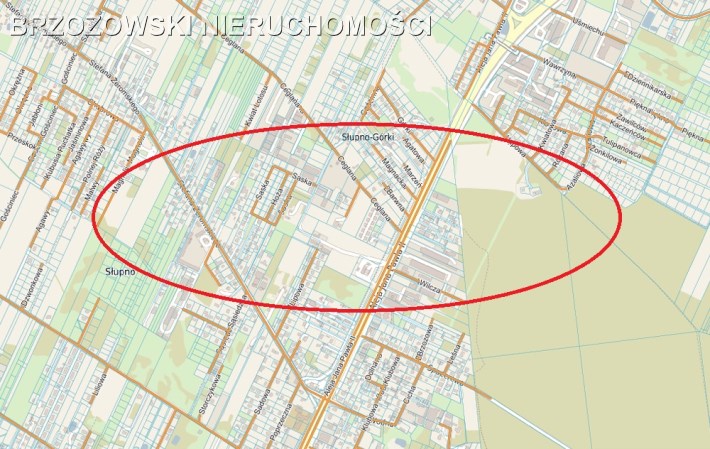 Do sprzedaży działka inwestycyjna o powierzchni 1,02 ha, zlokalizowana w Słupnie (gmina Radzymin), ok. 150 m od Al. Jana Pawła II (Droga wojewódzka 629).