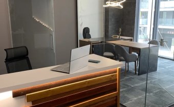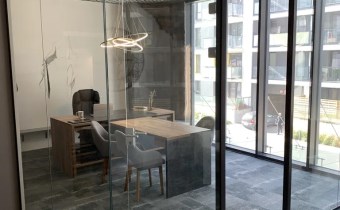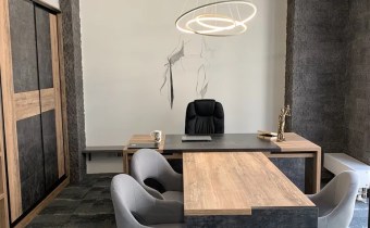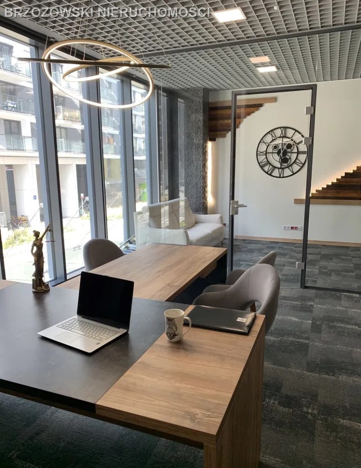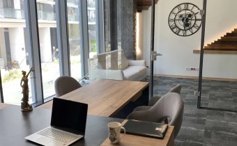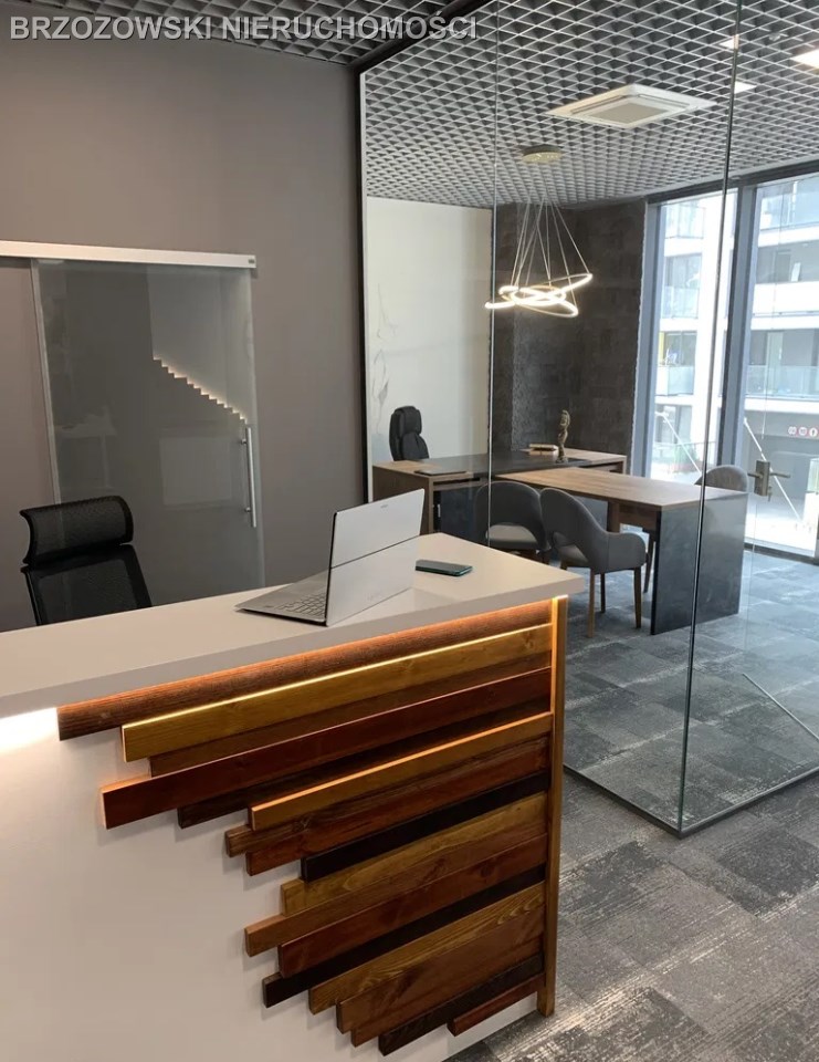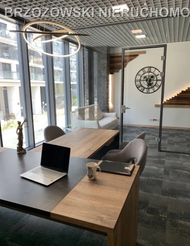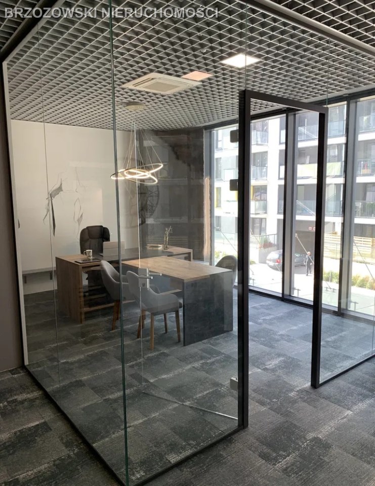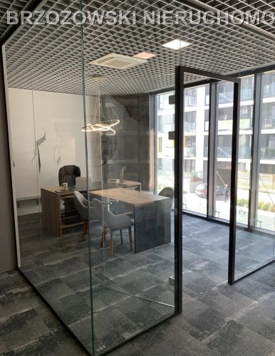 - pomieszczenie główne, przeszklone, z regulowanym biurkiem konferencyjnym na 6 osób oraz duża szafa w zabudowie na dokumenty oraz z przepiękną, wiszącą lampą,