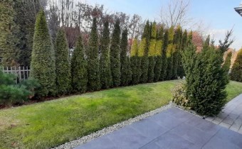 Pięknie zaprojektowany ogródek - znajduje się na nim kilkanaście dobrze utrzymanych gatunków drzew i krzewów. Wzdłuż ogrodzenia rośnie szpaler 3-metrowych zimozielonych tuj, które zapewniają prywatność i estetykę przez cały rok.
