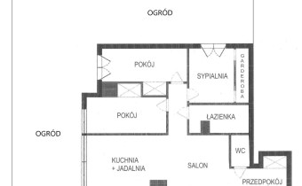 ROZKŁAD:  salon połączony z kuchnią i z jadalnią (28,22 m2), z salonu wyjście do ogrodu (130 m2), trzy sypialnie (9 m2, 8,4 m2, 8,26 m2), z dwóch sypialni wyjście do wspólnego ogrodu, garderoba (2,87 m2), hol i komunika (5,22 m2).