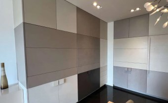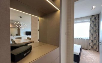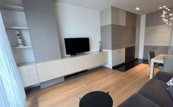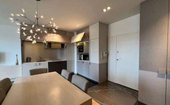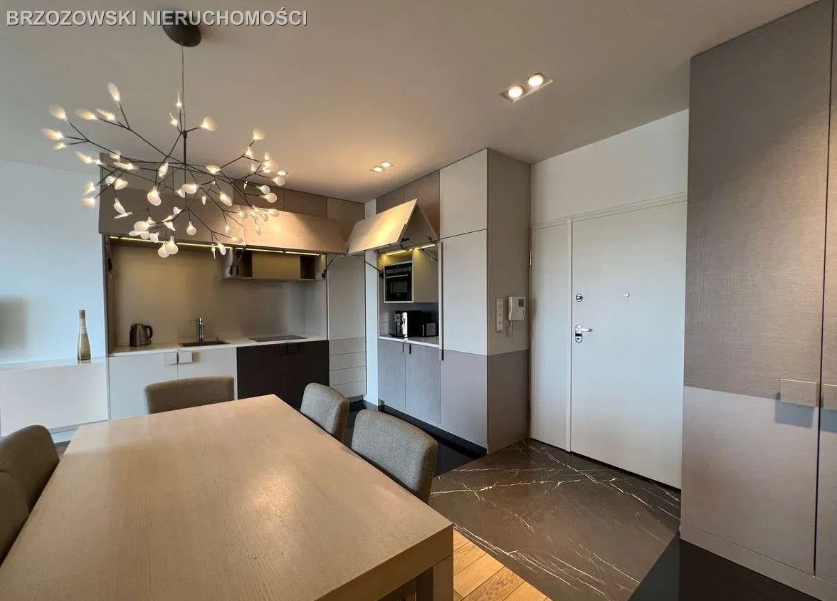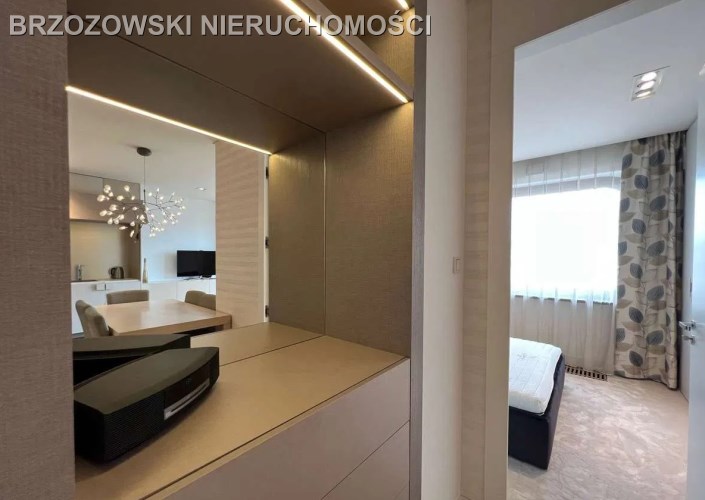 W apartamencie zastosowano najwyższej jakości materiały: m.in. drewniany parkiet, płyty granitowe, zabudowa stolarska firmy Dawidczyk, sprzęt AGD Siemens.