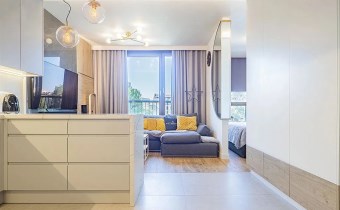 ROZKŁAD: salon z aneksem kuchennym, sypialnia, korytarz, łazienka z toaletą.