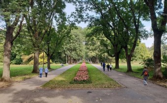 Wokół budynku dużo zieleni i drzew.