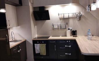 W kuchni zabudowa kuchenna (m.in. lodówka, zmywarka, płyta, piekarnik) z dużą ilością szafek.